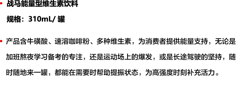 战马能量型维生素饮料是华彬快消品集团于2017年专为年轻人打造的能量饮料品牌,致力于满足消费者在工作、学习、运动及娱乐等多场景下对“补充能量、激活状态”的需求。